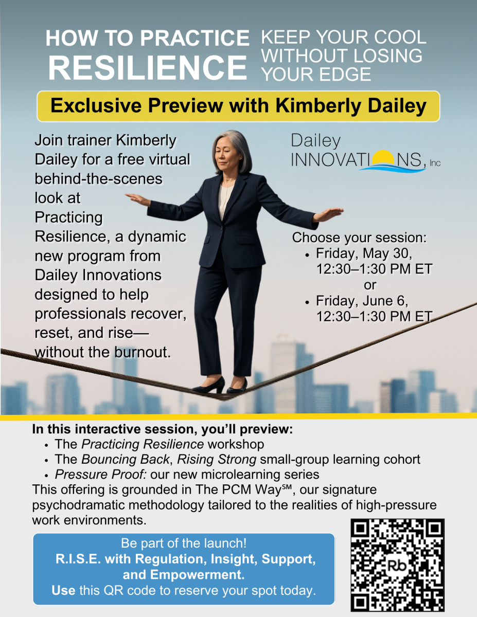• Join trainer Kimberly Dailey (’25) on Friday, May 30, or Friday, June 6 for a free virtual behind-the-scenes look at Practicing Resilience, a dynamic new program from Dailey Innovations designed to help professionals recover, reset, and rise without the burnout. Both hour-long sessions will be held at 12:30pm. More Information